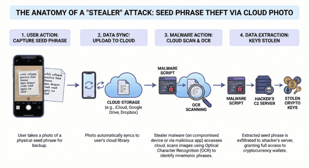 When you store a seed phrase on an internet-connected device, you are effectively placing it in a “Digital Dumpster” that hackers scour using automated scripts known as Stealer Malware. These programs run silently in the background, often hitching a ride on cracked software or innocent-looking browser extensions. They don’t need to control your computer manually; they simply sweep for specific data types: